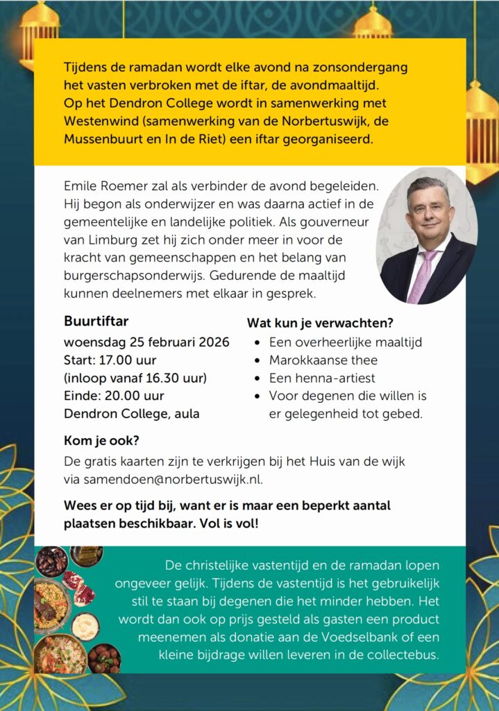 Tijdens de ramadan wordt elke avond na zonsondergang het vasten verbroken met de iftar, de avondmaaltijd. Op het Dendron College wordt ook in 2026 een buurtiftar georganiseerd in samenwerking met Westenwind.