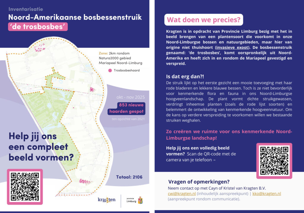 In opdracht van Provincie Limburg brengt adviesbureau Kragten de aanwezigheid van de trosbosbes in beeld. Deze struik, oorspronkelijk uit Noord-Amerika, heeft zich gevestigd in en rondom de Mariapeel. Hoewel ze er mooi uitziet en smakelijke bessen draagt, vormt ze een bedreiging voor ons kenmerkende hoogveenlandschap: ze verdringt inheemse planten en belemmert de ontwikkeling van waardevolle natuur.